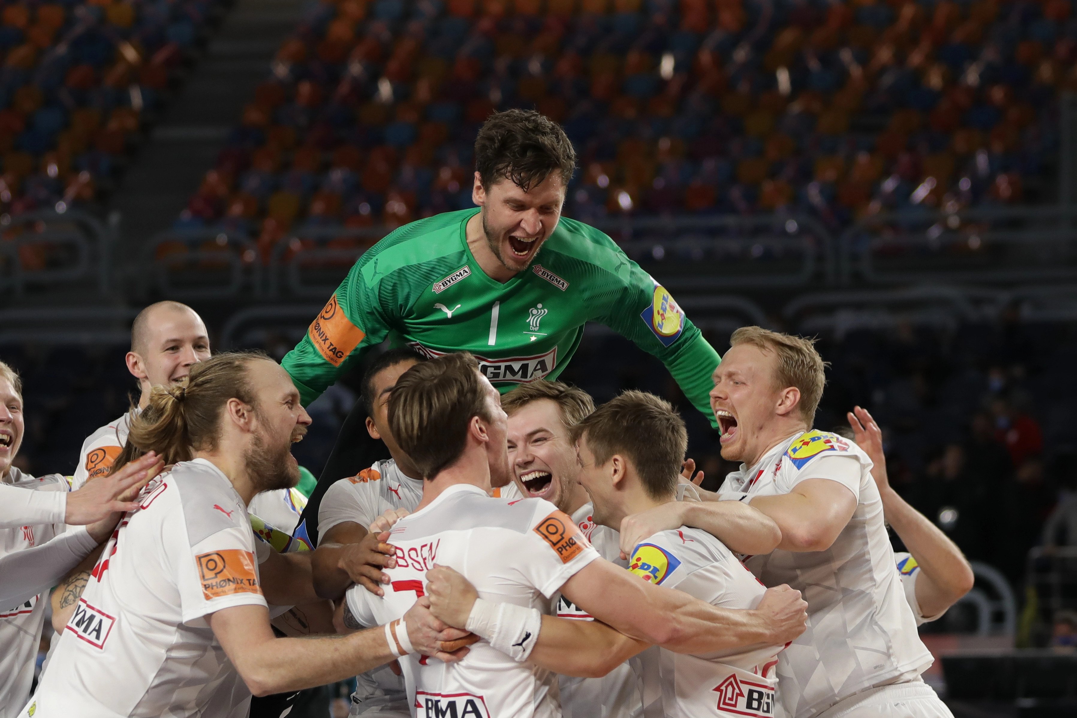Denmark: Niklas Landin Jacobsen (11/35 31%), Kevin Moller (4/13 31%), Magnus Landin Jacobsen 5, Emil M. Jakobsen 1, Anders Zachariassen 1, Magnus Saugstrup Jensen 6, Lasse J. Svan 6, Henrik Mollgaard Jensen 2, Mads Mensah Larsen 1, Mikkel Hansen 10, Morten Toft Olsen, Lasse B. Andersson, Nikolaj Oris Nielsen, Jacob T. Holm 1, Mathias Gidsel 6, Simon Hald Jensen